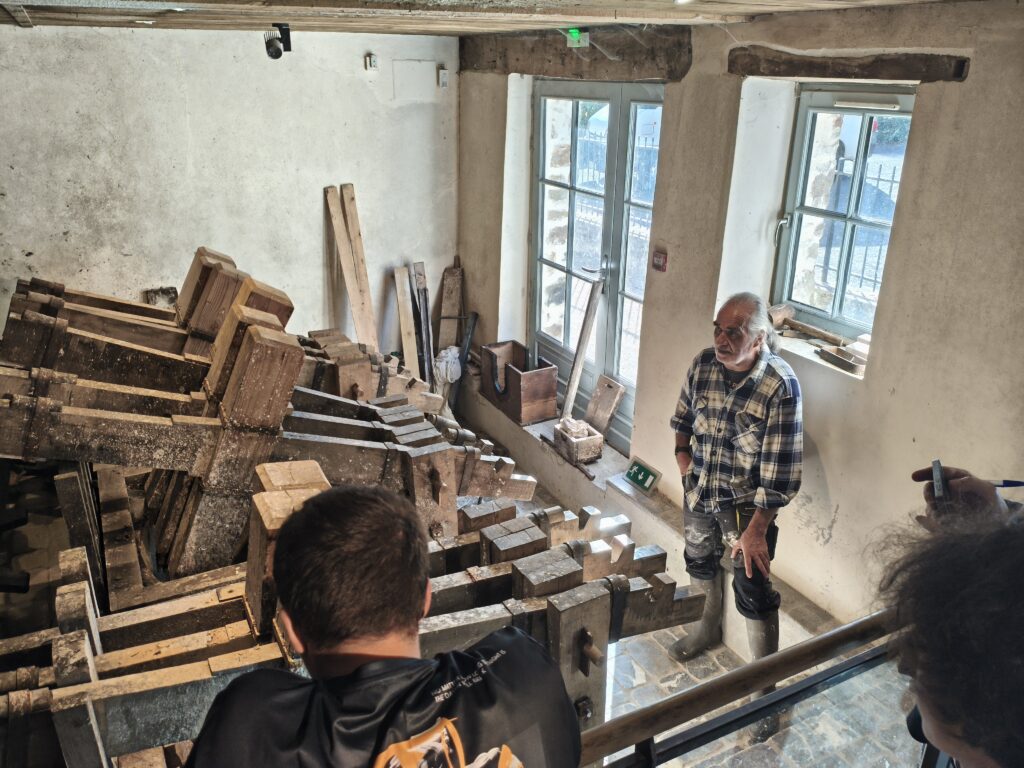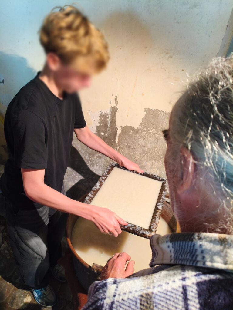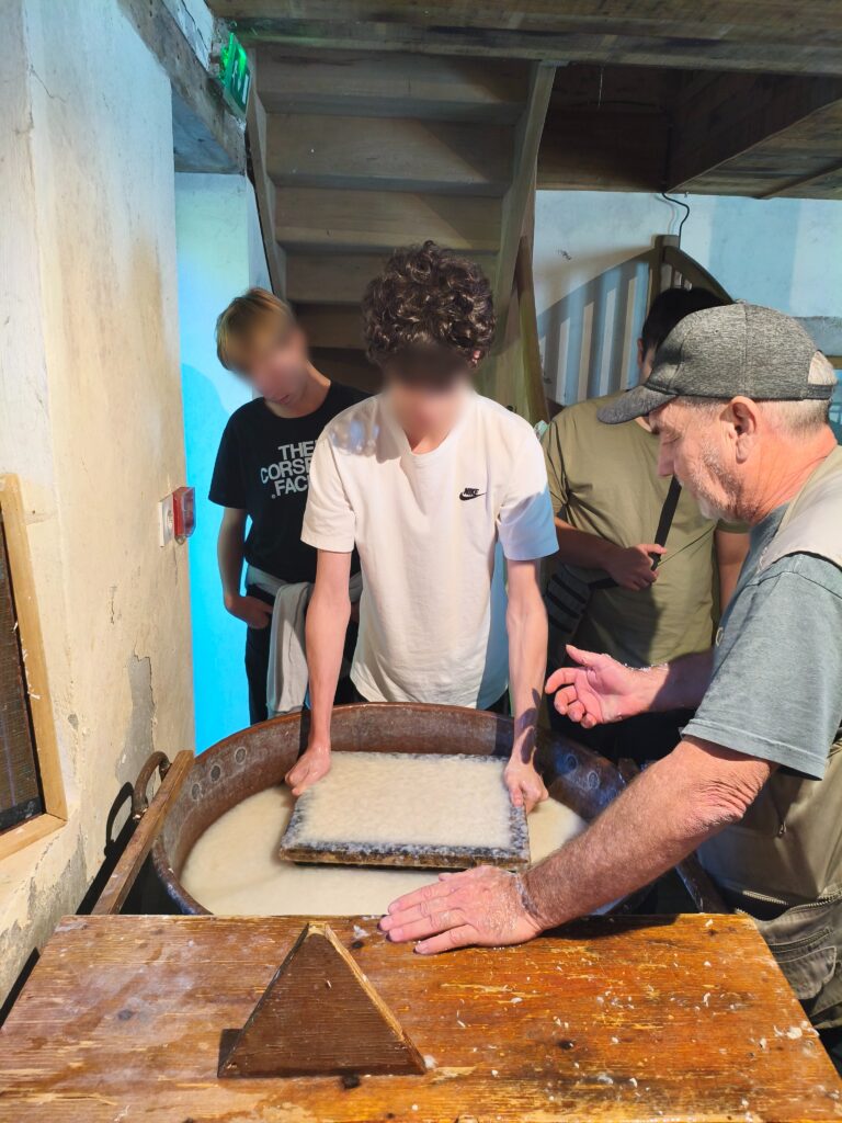Le lendemain, changement d’époque au Moulin à eau de Sainte-Suzanne (Mayenne). Les élèves ont fabriqué eux-mêmes une feuille de papier à partir de chiffon, selon les méthodes traditionnelles du XIIIe au XVIIIe siècle, lors d’un atelier de découverte du papier à l’ancienne.