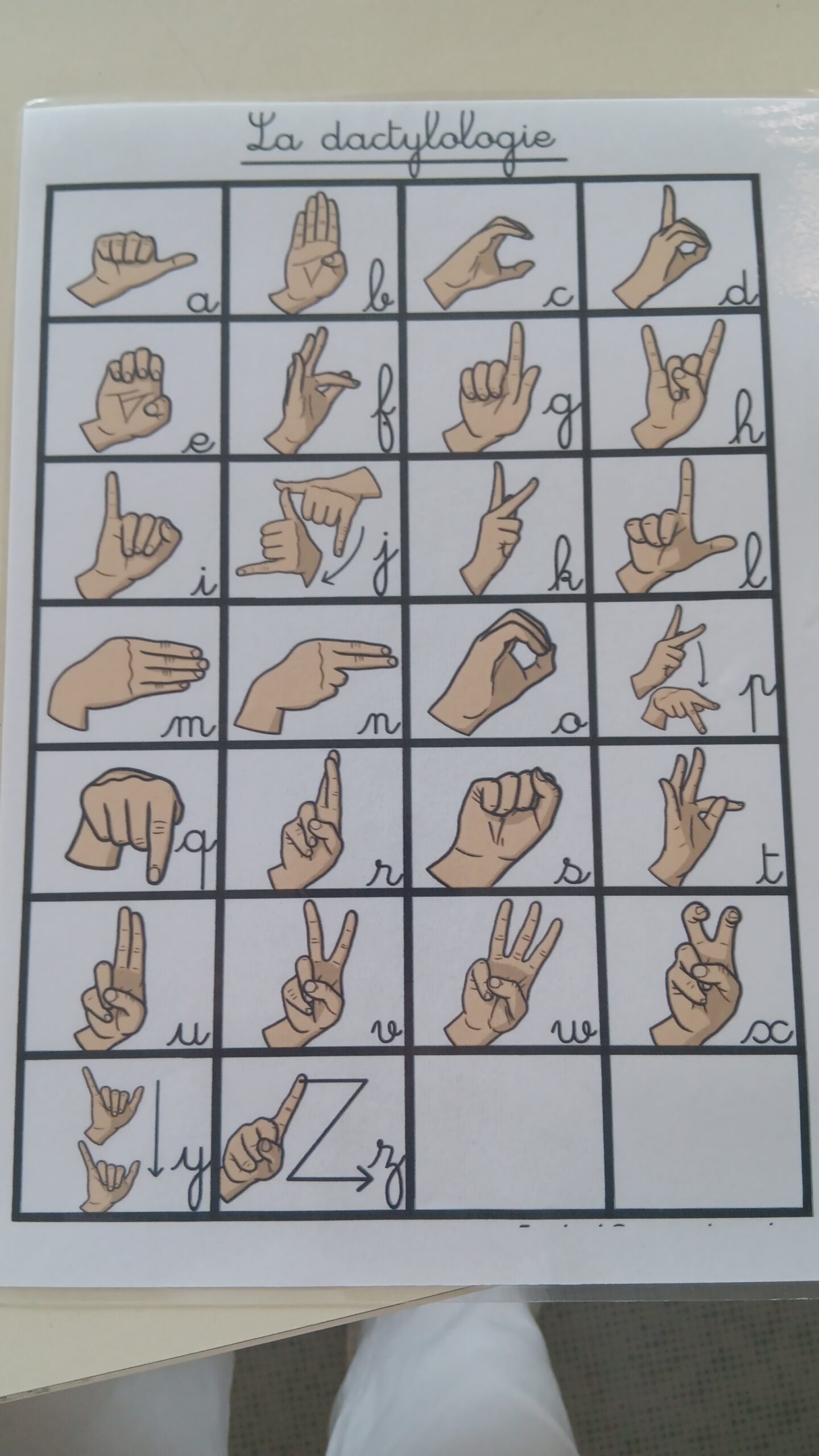 Les élèves peuvent poser des questions, puis Sandy apprend à ses camarades à signer la politesse de base : bonjour, merci, au revoir, s’il vous plaît, asseyez-vous, voulez-vous un café ou un thé, etc. Sandy et Sandrine passent ensuite dans la classe pour montrer aux autres élèves et les aider à s’entraîner. Elles présentent aussi l’alphabet, ou « dactylologie », par exemple pour signer un prénom et d’autres mots d’accueil comme bienvenue.