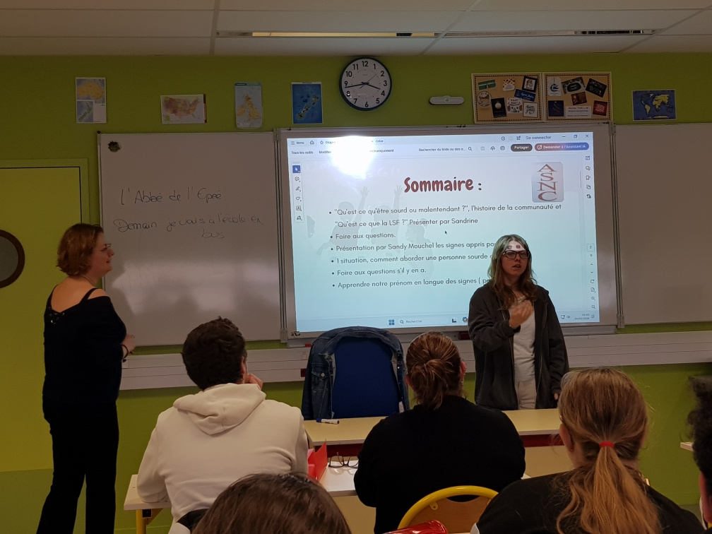 Le jour J, Sandrine Gros explique d’abord aux élèves de première et de terminale réunis pour l’occasion l’histoire de ce handicap et de la langue des signes, puis comment les personnes qui subissent ce handicap invisible perçoivent le monde. Elle insiste sur le fait que ces personnes comprennent nos émotions à travers nos expressions faciales plus rapidement que les personnes qui n’ont pas de problème d’audition et qu’il faut donc faire attention à notre attitude. Mme Gros apporte aussi des informations sur les sourds en France, par exemple qu’un enfant sur 100 naît sourd, mais que ce n’est pas héréditaire. Ou encore que la langue des signes française (LSF) n’est devenue une langue officielle qu’en 2005 avec la loi égalité des chances.