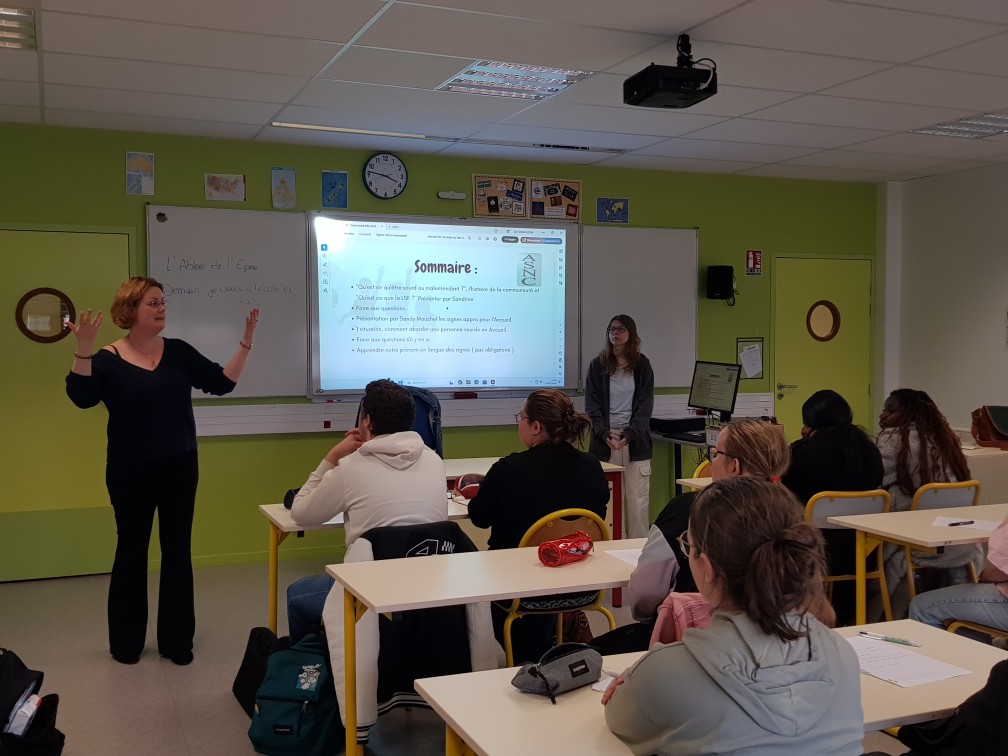 Le mardi 24 mars, dans l’après-midi, Sandrine Gros, bénévole de l’association ASNC (Association des sourds du Nord Cotentin), est venue à la rencontre des lycéens de la filière accueil du lycée Sauxmarais.